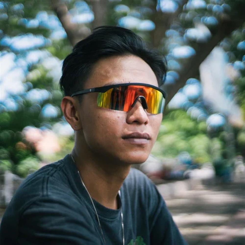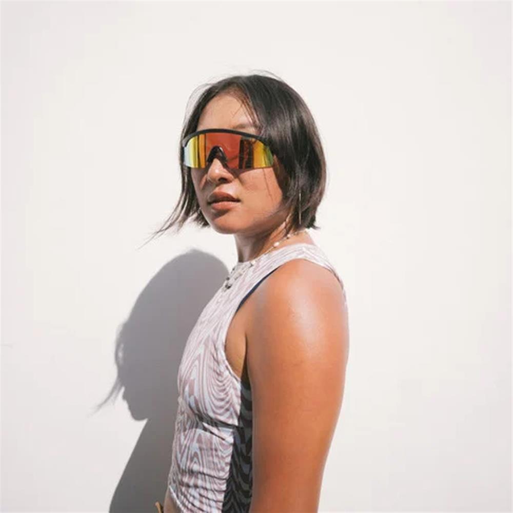 Lelle. Telaio stretto e veloce! Una cornice nera in plastica 100% riciclata abbinata ad una lente a specchio rossa polarizzata.
