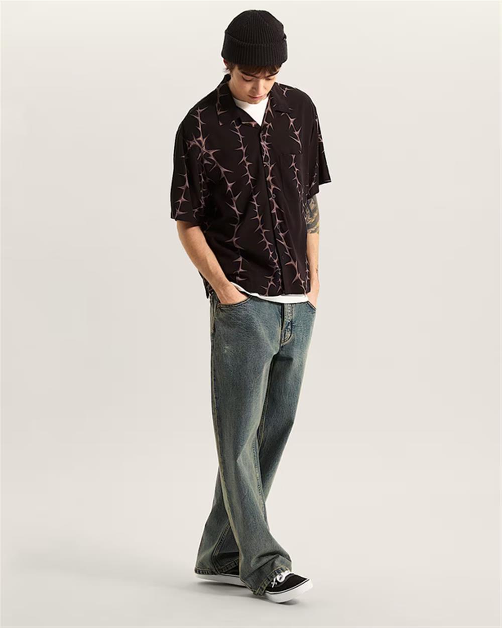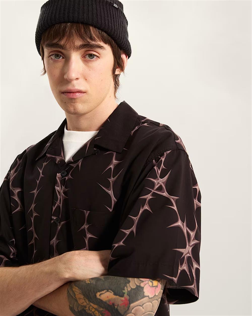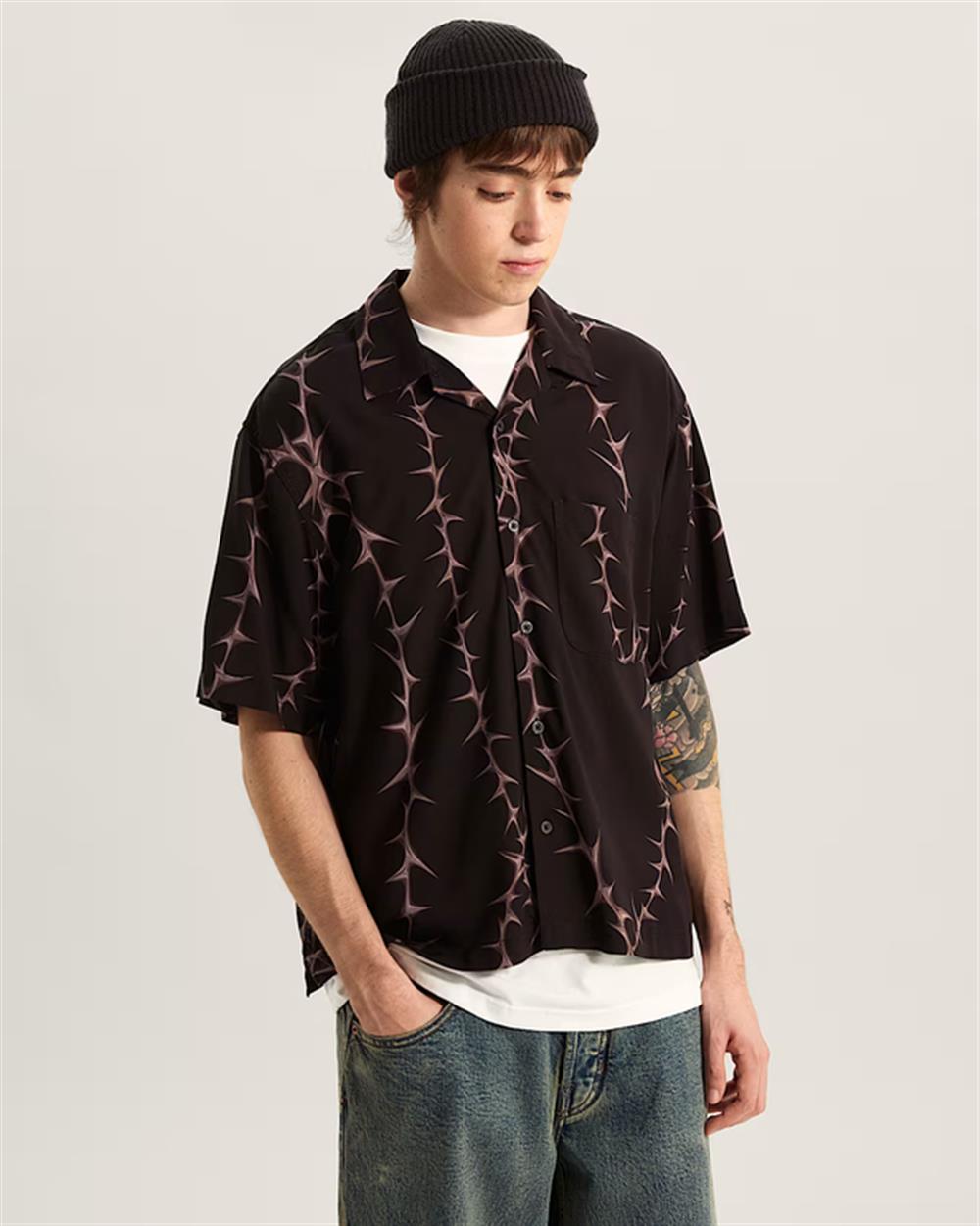 Questa camicia a maniche corte presenta un accattivante motivo di spine integrale per un look audace e anticonformista. La vestibilità rilassata e il tessuto morbido ti assicurano il massimo comfort mentre esprimi il tuo stile unico. Perfetta per farti notare nelle uscite informali o nelle serate fuori.